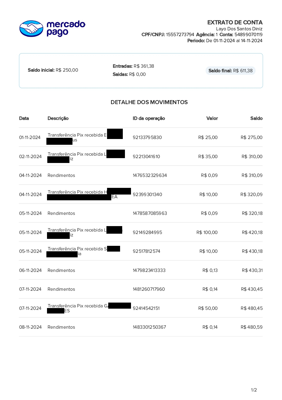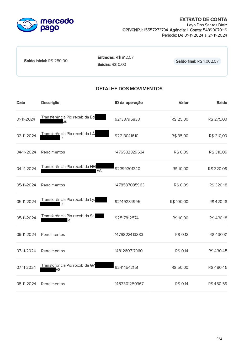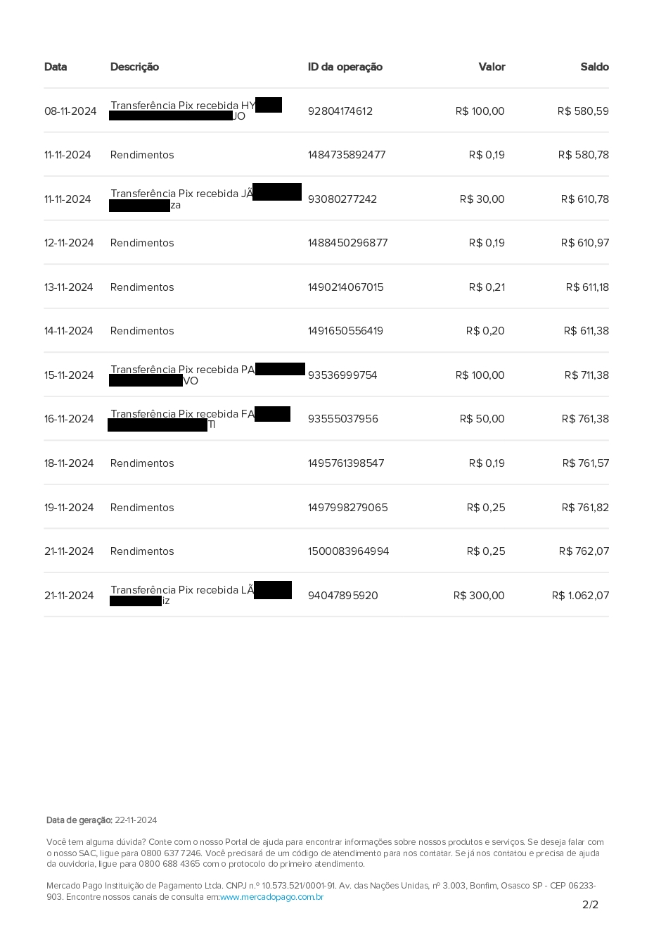 | 14/11/2024 | Rendimentos | + R$00,20 |