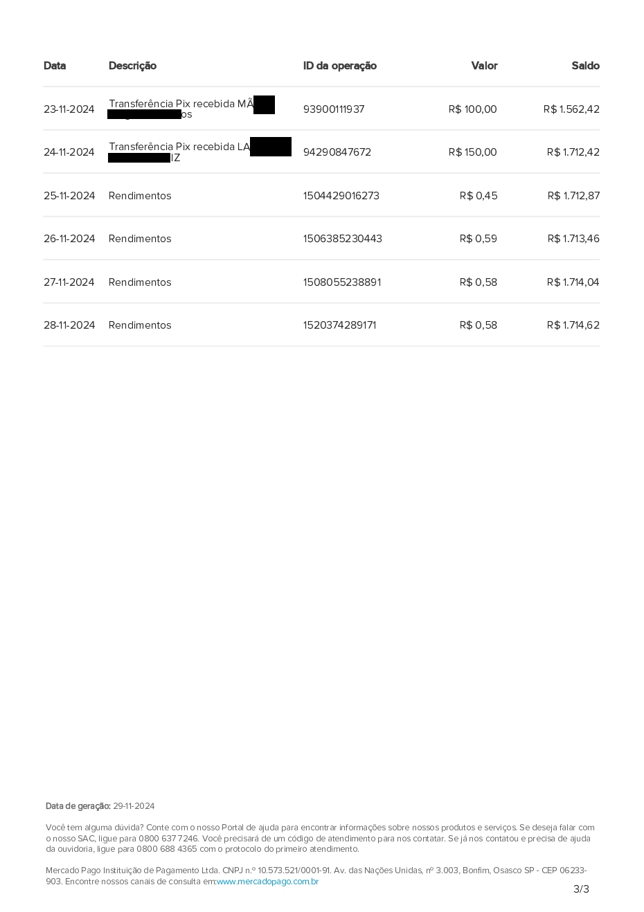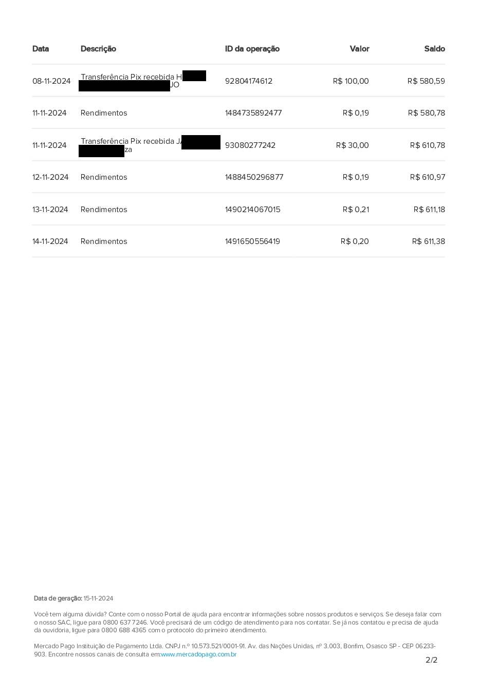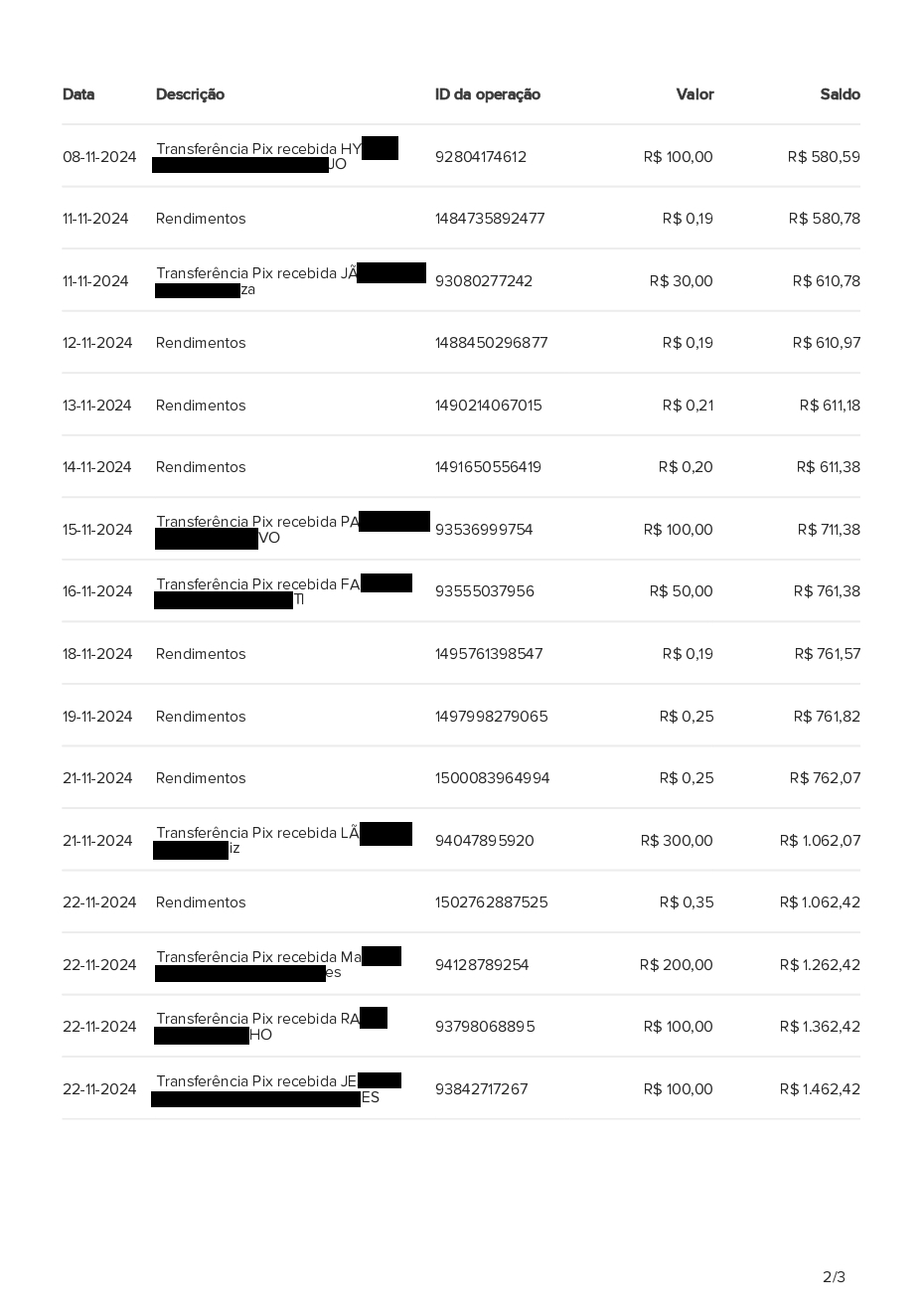 | 14/11/2024 | Rendimentos | + R$00,20 |