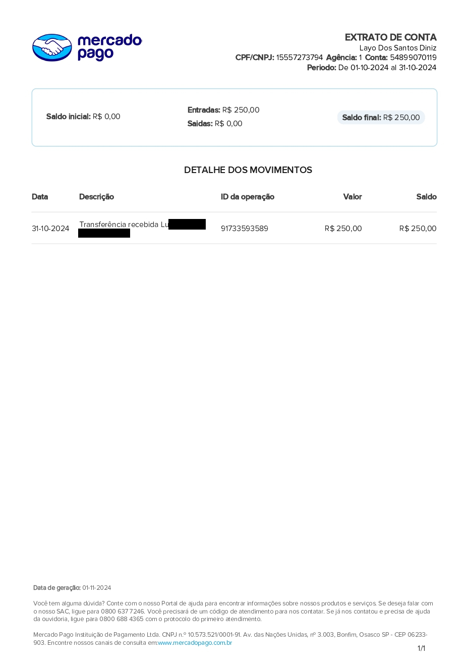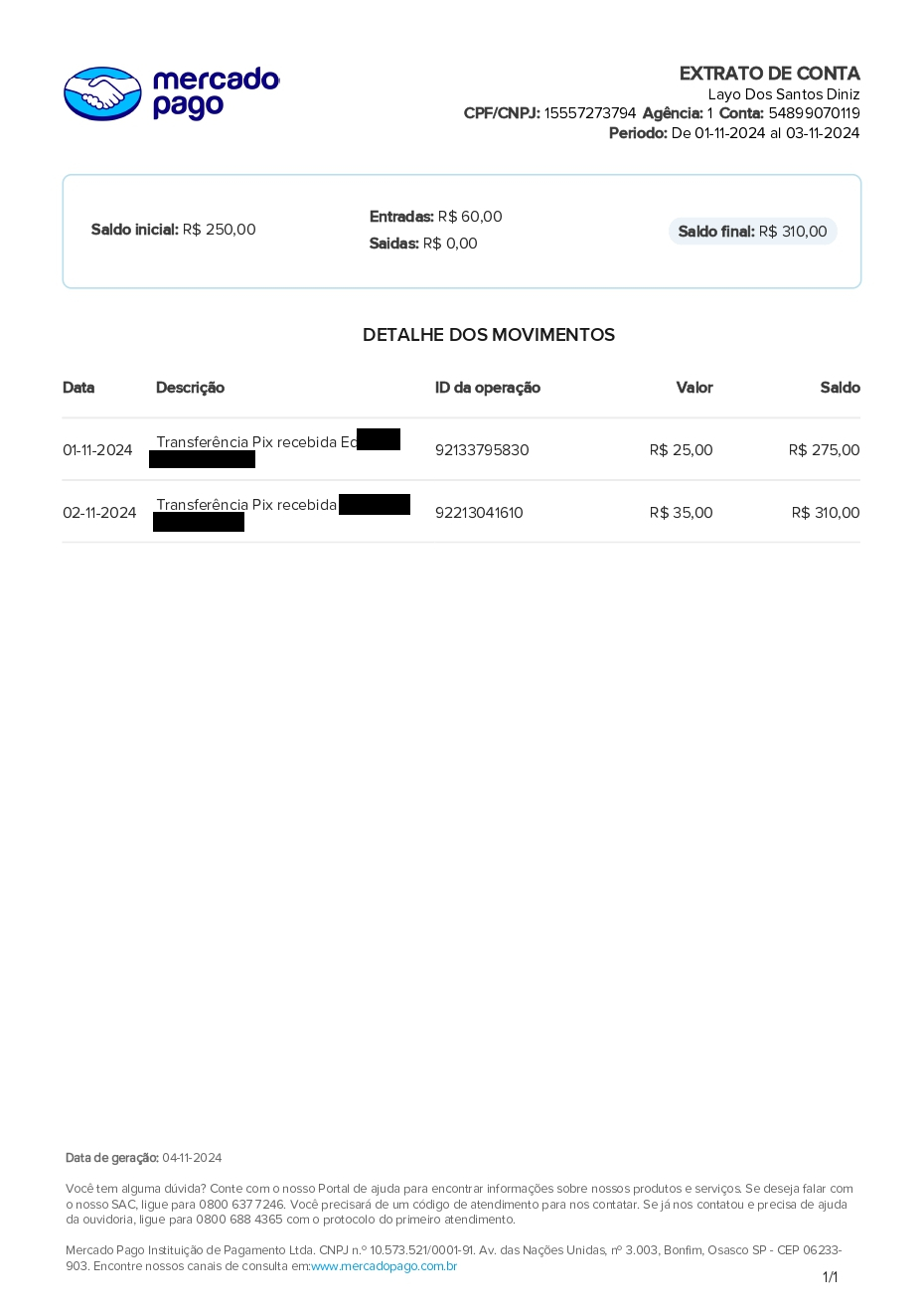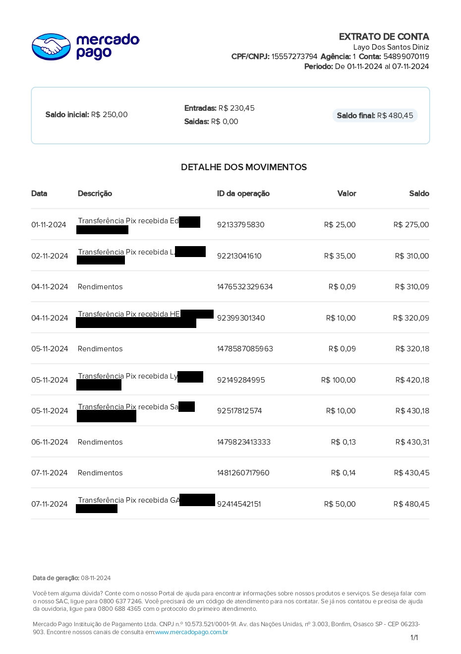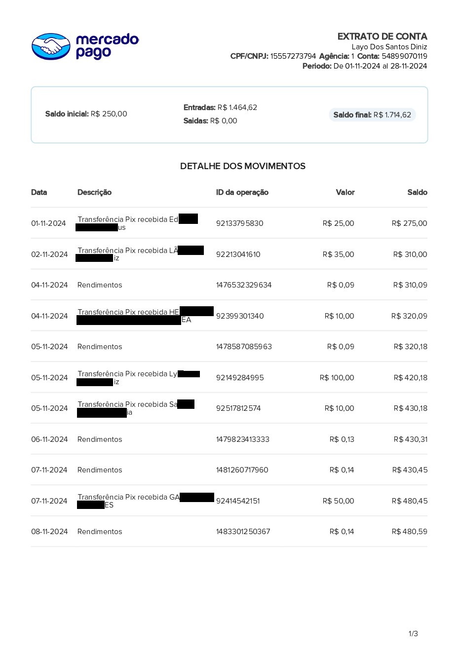 | 14/11/2024 | Rendimentos | + R$00,20 |